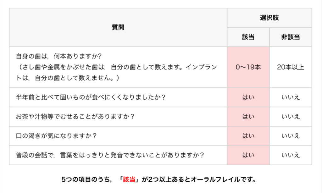ひとつの指標として上の質問表のうち2つ以上該当しているとオーラルフレイルの疑いがあります。