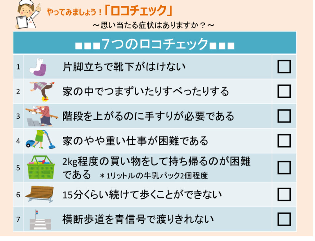 ひとつでもチェックがつくとロコモティブ症候群の可能性があります。