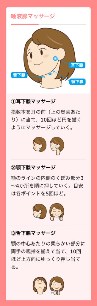 上記に書いてある通りに唾液の分泌を促すマッサージを行いましょう。
