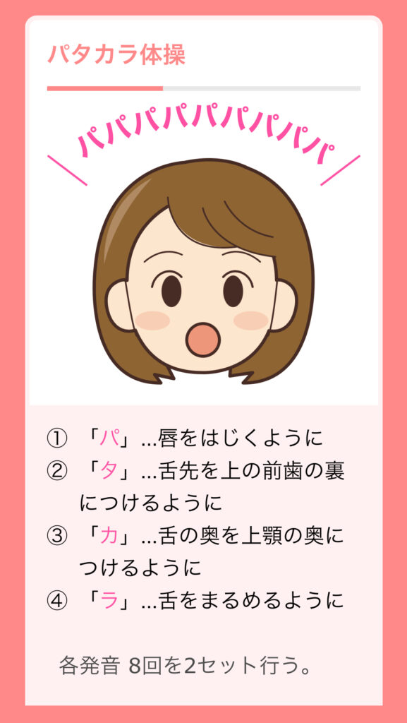 「パ」:お口を開け閉めする力を強くします。お口の周りの筋肉(口輪筋)を鍛えると、食べこぼしの予防につながります。弱くなると飲んだり吸ったりするのが難しくなります。