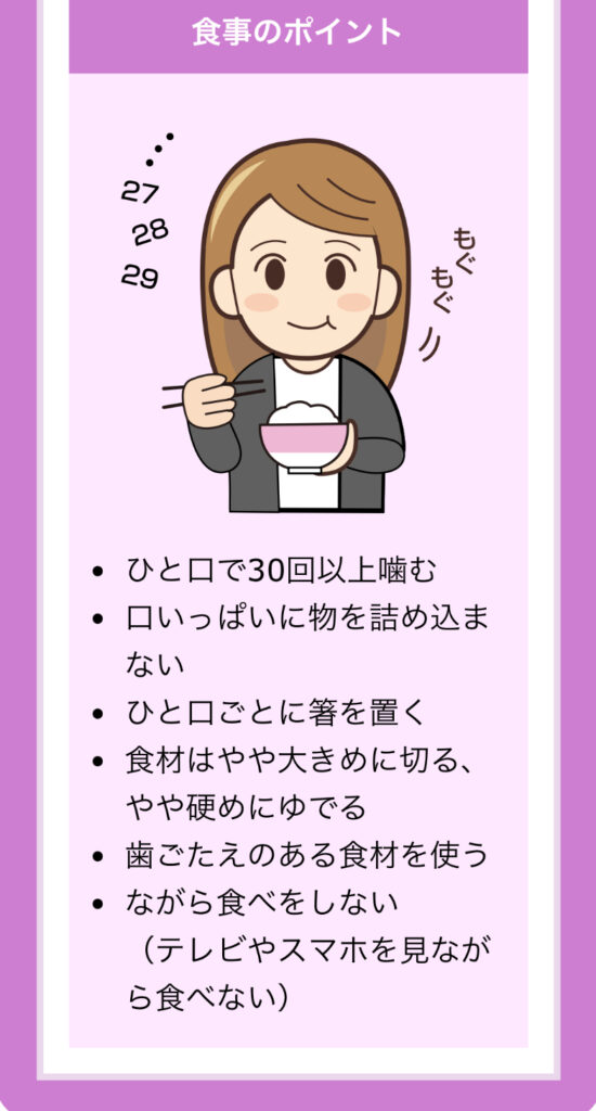 バランスの取れた食事を心がけ、よく噛んで食べるようにしましょう。