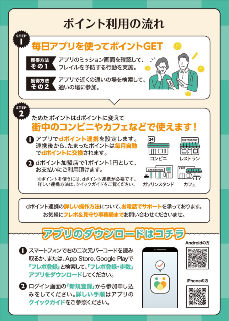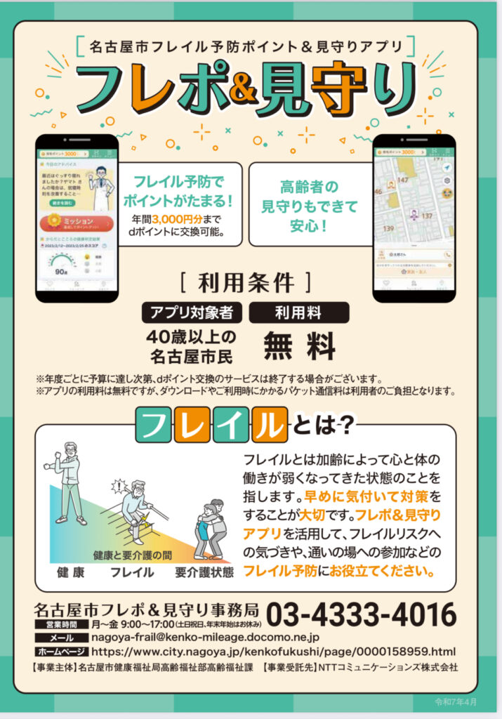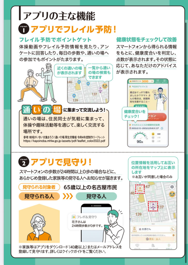名古屋市ではフレポ&見守りというアプリでフレイル予防や高齢者を家族が見守ることができます。