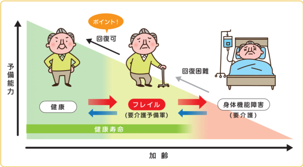 フレイルは健康と要介護の中間の状態ですが、早くに気づき栄養、運動、社会参加といった生活習慣を整えることで健康な状態へ回復することが可能という特徴があります。