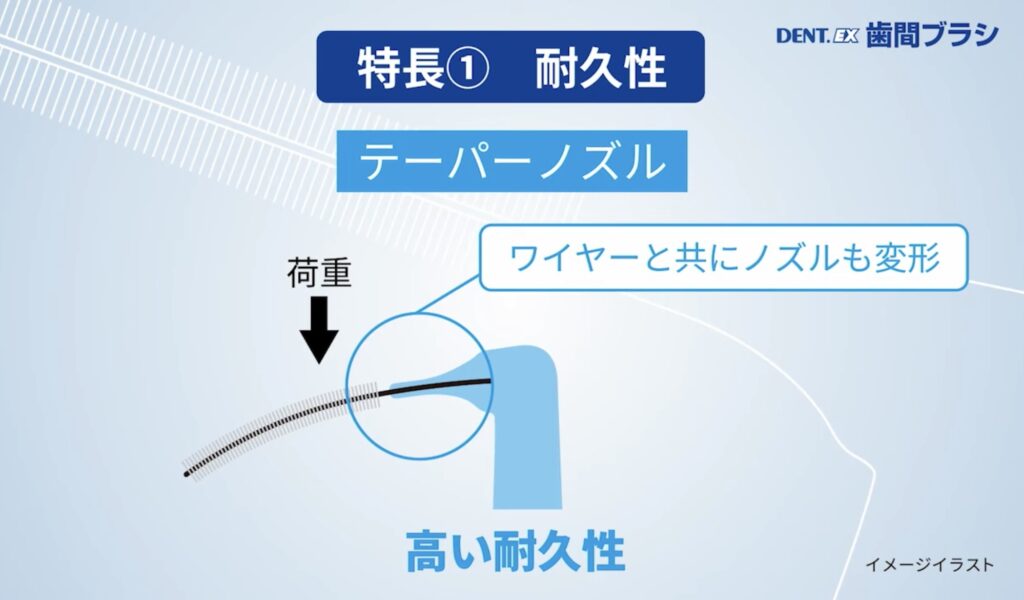 DENT.EX歯間ブラシは、4SからLLくサイズまで7種類。ブラシ部は先端がやや細く、根元が太いため挿入しやすく、植毛部の長さは歯間のプラーク除去に十分な10ミリです。