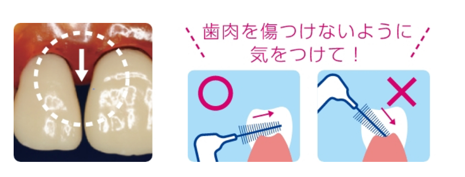 まずは、ブラシの挿入角度や押し下げすぎにより、歯間乳頭を押し下げないように注意しましょう!