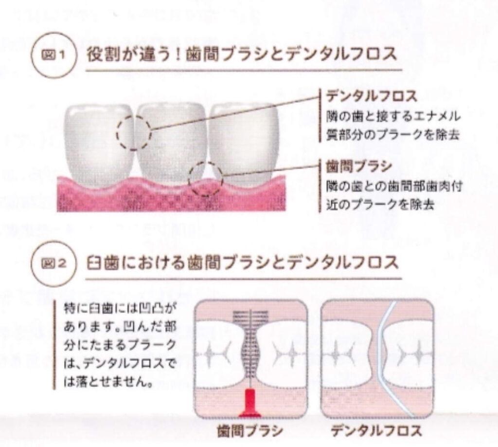 毎日のセルフケアで歯ブラシの毛先が届きにくい歯間部を清掃する用具には、歯間ブラシとデンタルフロスがあります。この2つは同じ歯間清掃用具でも、次のように用途や目的は異なります(図1、図2参照)。