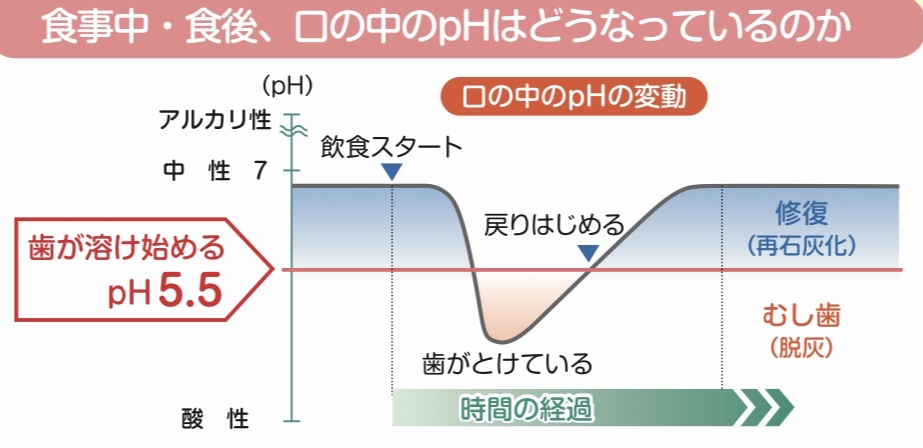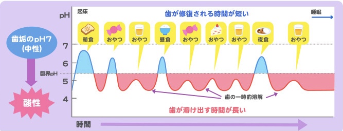 食事をすると歯は一時的に脱灰しますが、時間と共にpH が中性になり再石灰化がおこります。規則正しい食生活をしていれば、十分に歯が再石灰化される為、むし歯リスクは低くなります。