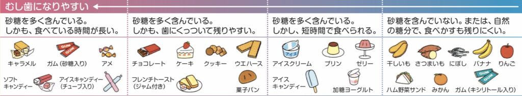 だらだら食べてしまうと1日のうちで歯が溶ける時間が長くなり、再石灰化が間に合わなくなる為、むし歯リスクが高くなります。