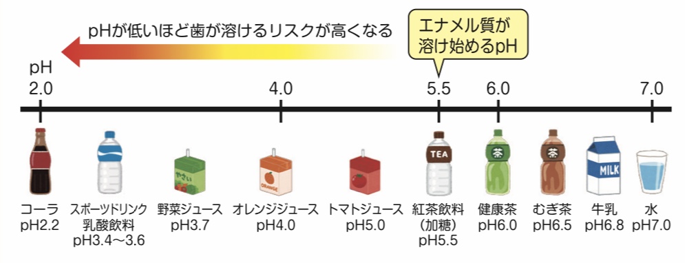歯の表面を覆うエナメル質はpH5.5、中心の象牙質はpH 6.0以下で脱灰することが知られていますが、市販の飲料の73%が歯を溶かす程の酸性(pH 5.5以下)をがあるようです。