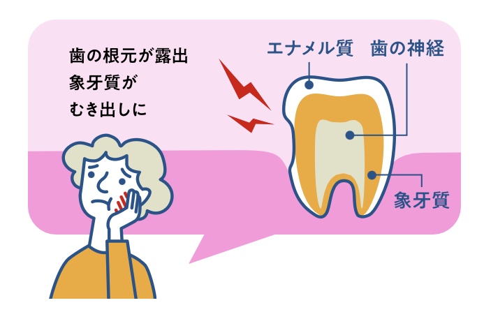 歯肉が後退すると、歯の根元の部分が露出します。この部分はエナメル質がなく、象牙質がむき出しの状態になります。このような象牙質表面では、歯ブラシが触れたり、温度変化などの刺激で痛みを感じることがあります。持続時間は長くても1分以内で、時間が経てば痛みは消失します。歯の表面に歯石がたくさん付いているような場合、それを取り除いた時にも同様の状態となり、歯石をとっている時にも器具が象牙質表面に触れたり、水をかけて処置をするので、知覚過敏と同様の痛みを感じることがあります。