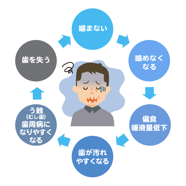 食べる時間が短い、噛まない、噛んでいない、、、“流し食べ“になっていませんか❓噛まない食事を続けるとイラストの様な噛まない食べ方のサイクルになります。