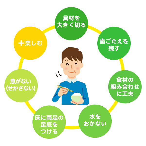 使ってない筋肉が衰えるように歯も口も使わなければ衰えてきます。しっかり噛んで食べる習慣は大切です。まずは一口目を意識して噛んで食べてみましょう。