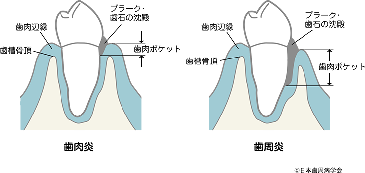 歯槽骨吸収や歯根と歯槽骨の間にある歯根膜の破壊があり、ポケットの底部が歯根の先端方向に移動した状態を歯周ポケット(真性ポケット)とよび、その場合の病名は歯周炎です。