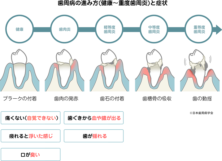 歯周病は、時に急性化することもありますが、一般的にあまりはっきりとした症状がなく静かに進行します。主な自覚症状としては、歯ブラシ時の出血、口臭や口の中のネバつきなどの症状がありますが、いずれも我慢ができない症状ではありません。