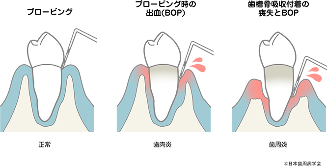 一方炎症が強く、歯槽骨吸収や歯根膜の破壊が有る場合は、プローブはポケット底部を貫通し、プロービング時に出血を認めます。